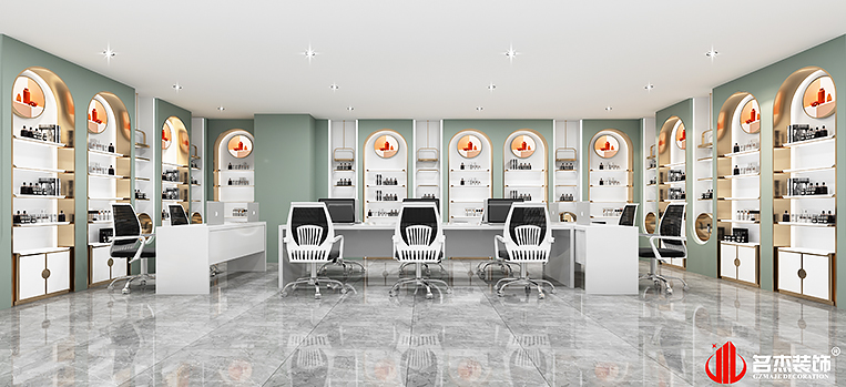 這次美業紋飾案例中使用的是時下流行的潮流元素,結合該行業是接觸時尚前端的行業,也是一個能夠突出美的行業,對此設計團隊使用莫蘭迪色系來作為展廳空間的主色調,強調時尚元素的同時,還能夠讓空間增加更多的設計感。利用吊飾吊燈來作為空間的點睛之筆,空間感強烈的同時,還能夠讓空間的層次感更加突出。