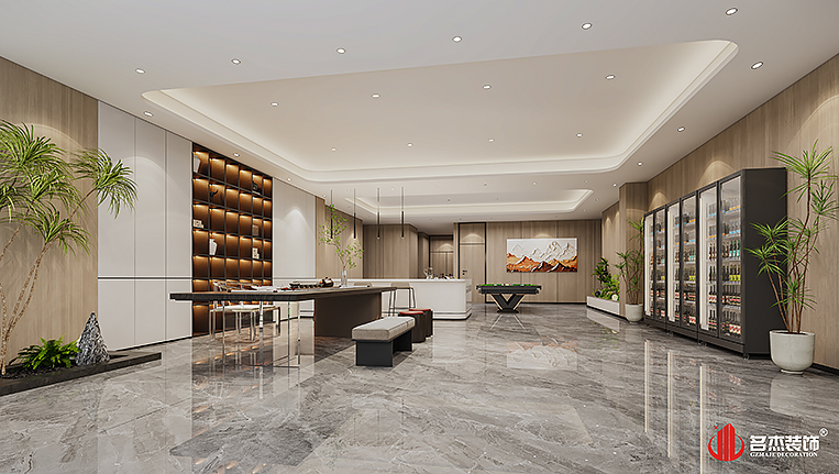 空間中的前臺接待區(qū)域使用造景的設(shè)計手法,來突出風(fēng)生水起的設(shè)計重點,配合前臺背景墻使用的碳晶板,以及燈條作為點綴設(shè)計元素,搭配出不一樣的裝修設(shè)計效果。對于棋牌休閑空間來說,燈光是非常重要的元素之一,因此設(shè)計團(tuán)隊也著重在這方面上的設(shè)計,通過使用造型不同的燈具,為空間增加了不少的時尚潮流感。#廣州公裝裝修公司#